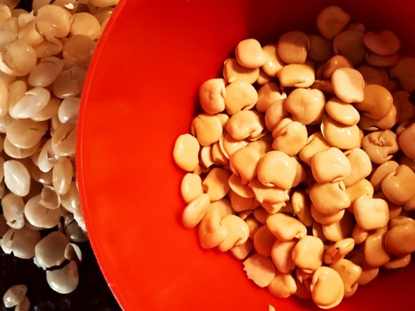 La piel de los altramuces es muy gruesa y conviene quitársela, para que quede más fino una vez triturado, la piel se quita fácilmente, rompiéndola un poco con la uña y apretando para que salga el interior.