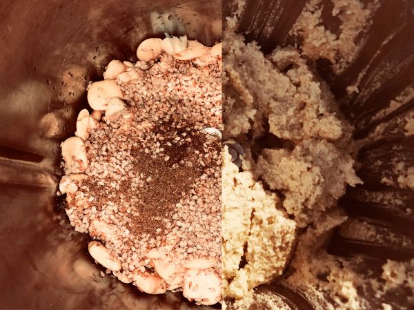 Añadimos a la batidora o el procesador de alimentos, los altramuces y el sésamo, los ajos, el comino y el zumo de limón si los tenemos.