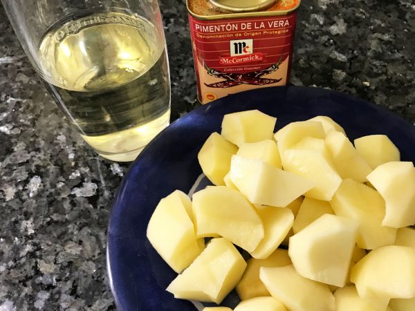 Las patatas las pelamos y cortamos rompiendo el corte al final (sistema conocido como chascar las patas, al romperse un trozo queda irregular y saca más almidón al caldo espesándolo). Las reservamos lo mejor a remojo.
