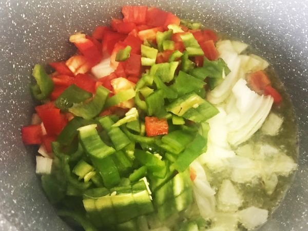En una cazuela ponemos aceite en el fondo y añadimos la cebolla o el puerro y el pimiento y comenzamos a sofreír.